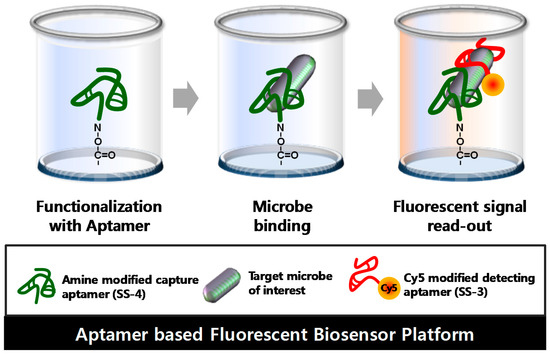 Principle of S. sonnei detection using an aptamer-based fluorescent biosensor platform. An aptamer-based fluorescent biosensor platform comprised of three major factors: the functionalized surface by the capture aptamer (SS-4), target binding, and signal read-out by the Cy5-labelled detection aptamer (SS-3).