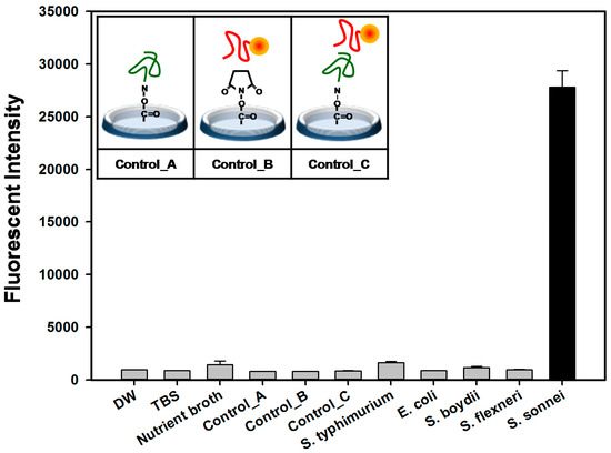 As control experiments, the activated and functionalized surface by capture aptamer (control_A), the carboxyl group coated microtiter plate surface (control_B), and aptamer-aptamer binding without bacteria cells (control_C) were compared simultaneously. S. sonnei detection by aptamer sandwich pairs in our aptamer-based fluorescent biosensor platform was clearly distinguishable from the controls (A to C), nutrient broth (LB), buffer solution (TBS), and DW.