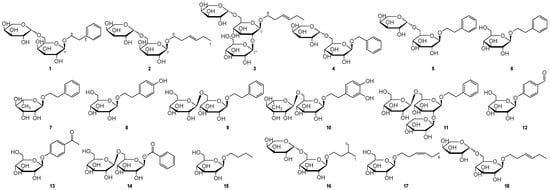 All compounds 1–18 were evaluated for their anti-inflammatory activities (Table 2) inhibiting NO production of LPS-induced RAW 264.7 cells in vitro [27]. NO, as a key pro-inflammatory mediator, could suppress inducible enzyme expression via inhibition of the mitogen-activated protein kinase pathway and nuclear translocation of critical transcription factors [28,29]. The results suggested that the isolated compounds (1–18) possessed different degrees of activities in inhibiting NO production. For the compounds with the same mother nucleuses (1, 5, 6, 7, 9, 11), compounds 7 and 11 showed weaker activities than others, which might be due to the moieties of rhamnose or trisaccharide. Compounds 8 and 10 showed weaker activities than other phenylethanoid glycosides, which might be ascribed to the hydroxy-substituted benzene rings.