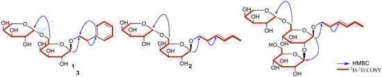 Key HMBC and 1H-1H COSY correlations of compound 1–3.