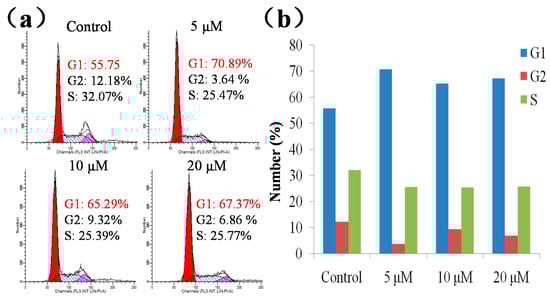 Cells were seeded in six-well tissue culture plates (1 × 105 cells per well), and the cell cycle arrest was analyzed by flow cytometry as previously described [32]. After incubating with different concentrations of 1 (0, 5, 10, and 20 μM) for 72 h, cells were trypsinized, washed with PBS, and fixed with 70% ethanol overnight at 4 °C. The fixed cells were washed with PBS and stained with propidium iodide (PI) for 15 min in the dark, then the cell cycle arrest was analyzed with an Epics XL-MCL flow cytometer (Beckman Coulter, Miami, FL, USA).