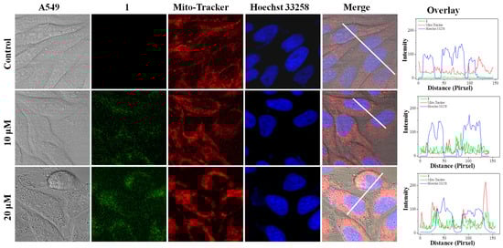 Cellular localization of 1 in A549 cells. Cells were treated with the 1 for 6 h at 37 °C [1] = 0, 10 and 20 μM: green, 1; blue, Hoechst 33258; red, Mito-Tracker. The overlay data were analyzed using Image Pro Plus.
