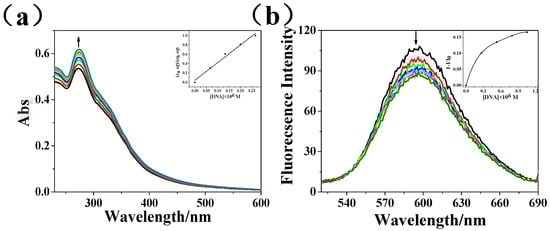 Electronic spectra titration experiment was carried out to monitor the interaction of 1 with bcl-2 G-quadruplex DNA. As shown in Figure 3a, the electronic spectra of 1 in Tris-HCl buffer (pH = 7.2) solution exhibited the characteristic IL (intraligand charge transfer) absorption in the range of 250–300 nm with the maximum at about 273 nm. When the DNA was gradually added to the solution of the complex, a hyperchromic effect and a bathochromic effect were observed. The hyperchromism value of 1 at the IL absorption band was about 14.1% (Δλ = 2.1 nm), which may be attributed to bases of the DNA exposed, when the ligand binding to DNA, induced external contact or to partial uncoiling of the DNA structure [24,25]. Furthermore, the value of the intrinsic binding constant (Kb) for 1 was about 8.7 × 107 M−1, calculated according to the decay of IL absorption. These data implied that 1 bound to bcl-2 G-quadruplex DNA with high affinity in intercalating mode [26]. The interaction was further confirmed by the following fluorescence quenching experiment.
