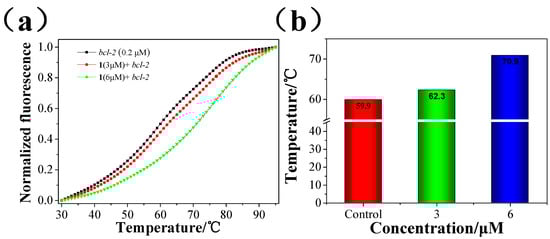 To confirm the stability of the bcl-2 G4 DNA in presence of 1, FRET melting assay was carried out, the results were shown in Figure 4a, and the melting point of the concentration–dependent melting curves of 1 were showed in Figure 4b. Treated with 3.0 μM of 1, the ΔTm of bcl-2 G4 DNA was about 2.4 °C, while the ΔTm of bcl-2 G4 DNA increased about 11 °C after incubated with increasing the concentration 6.0 μM of 1. These results indicated that 1 behaved to stabilize bcl-2 G-quadruplex DNA [28].