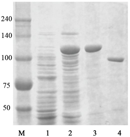 The GST-fused BglG167b protein was purified using GST-Bind agarose resin. The recombinant enzyme was purified by GST-Bind agarose resin, and then the purified protein was determined using SDS-PAGE analysis (Figure 1). The molecular mass of the GST-BglG167b calculated via an amino acid sequence was 116 kDa, which is similar to the mass detected by SDS-PAGE. In addition, the recombinant GST-BglG167b contains 36.5 ± 1.4% of total soluble proteins in the cell lysate.