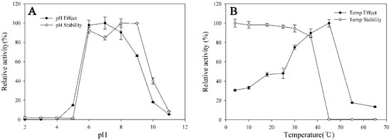 Effects of pH (A) and temperature (B) on the stability and activity of recombinant BglG167b.