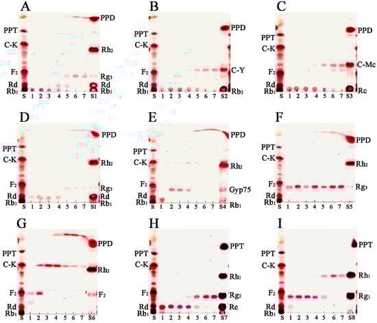 TLC analyses of time-course of ginsenoside bioconversion by BglG167b at an enzyme concentration of 1.0 mg/mL. (A) the transformation of Rb1; (B) the transformation of Rb2; (C) the transformation of Rc; (D) the transformation of Rd; (E) the transformation of gypenoside XVII; (F) the transformation of Rg3(S); (G) the transformation of F2; (H) the transformation of Re; and (I) the transformation of ginsenoside Rg1. Developing solvent: CHCl3–CH3OH–H2O (70:30:10, v/v, lower phase). Lane S, standards (Rb1, Rd, F2, C-K, PPT, PPD); Lane S1, standards (Rb1, Rd, Rg3(S), Rh2(S), PPD); Lane S2, standards (Rb2, C-Y, PPD); Lane S3, standards (Rc, C-Mc, PPD); Lane S4, standards (Rb1, GypXVII, GypLXXV, Rh2(S), PPD); Lane S5, standards (Rg3(S), Rh2(S), PPD); Lane S6, standards (F2, Rh2(S), PPD); Lane S7, ginsenoside standards (Re, Rg2(S), Rh1(S), PPT); Lane S8, ginsenoside standards (Rg1, Rh1(S), PPT); Lane 1, control; Lane 2, 5 min; Lane 3, 30 min; Lane 4, 3 h; Lane 5, 10 h; Lane 6, 24 h; Lane 7, 48 h.