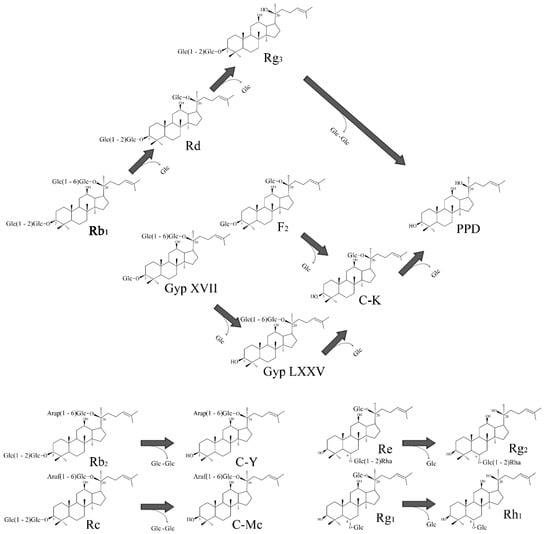 Ginseng (Panax ginseng C.A. Meyer) has been widely used to treat various diseases for thousands of years in Asian countries and, nowadays, is used as a medicinal herb or functional food all over the world [1,2]. Ginsenosides are considered as the main active ingredients responsible for pharmacological activities of the ginseng root, such as anti-cancer, anti-obesity, anti-inflammatory, antioxidant, and hepatoprotective activities [3,4,5,6,7]. The six major ginsenosides (Rb1, Rb2, Rc, Rd, Re, and Rg1) constitute more than 80% of the total ginsenosides in ginseng root, and various minor ginsenosides (Rg3(S), Rh2(S), F2, compound K (C-K), Rg2(S), Rh1(S), F1, protopanaxadiol (PPD) and protopanaxatriol (PPT), and gypenoside XVII (GypXVII)) that are deglycosylated from the major ginsenosides exist in smaller amounts in ginseng [8,9,10,11]. Major ginsenoside Rb1 is relatively abundant in ginseng, and it can be deglycosylated into rare minor ginsenosides (F2, Rg3(S), Rh2(S), CK, PPD) which have enhanced anti-cancer activities [12,13].