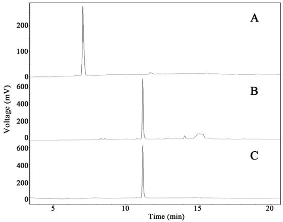 HPLC results of the production of GypLXXV from GypXVII by BglG167b; (A) substrate GypXVII; (B) the reaction mixture after nine-hour treatment with BglG167b; and (C) purified GypLXXV using Prep-HPLC.