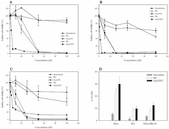The anti-cancer effects of GypLXXV, Rg3(S), GypXVII and Rb1 on cell viability on (A) HeLa cells; (B) B16 cells; (C) MDA-MB231; and (D) LC50 comparison of doxorubicin, Rg3(S), and GypLXXV. Cancer cells were incubated with various concentrations of GypLXXV for 48 h.