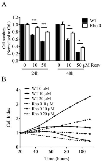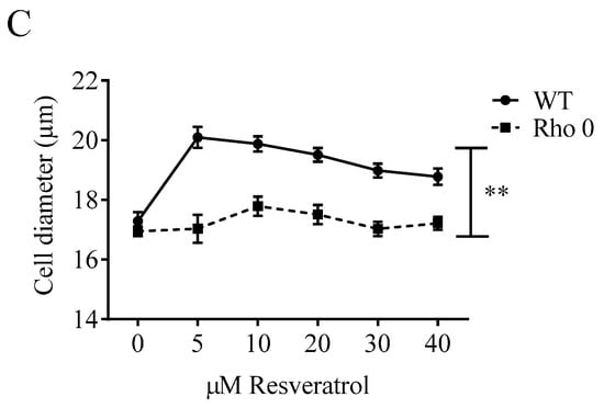 Cell proliferation was studied in both HeLa WT and Rho 0 cells by following the cell number counts up to 48 h with or without Resv treatment. Resv decreased the cell number concentration-dependently in both HeLa WT and HeLa Rho 0 (Figure 1A). The cell number counts were significantly lower in HeLa WT compared with HeLa Rho 0 at both 10 and 50 µM Resv at 24 h (p < 0.001 (***)) and 48 h (p < 0.01 (**), p < 0.05 (*)). As the number of cells exposed to 50 µM Resv at 24 and 48 h still is higher than the numbers at 0 h, a cytostatic effect of Resv is more likely than a cytotoxic effect. This further indicates that the absence of functional mitochondria decreases the effect of Resv on cell proliferation. However, the stronger effect of Resv in HeLa WT cells could in part be explained by a higher proliferation rate in HeLa WT relative to HeLa Rho 0 cells, also shown by the impedance data (Figure 1B). Resv increased the cell diameter in HeLa WT already at 5 µM Resv lasting up to 40 µM Resv, whereas Resv treatment did not increase cell diameter in HeLa Rho 0 (Figure 1C). The obtained data from HeLa WT and HeLa Rho 0 cells were supported by experiments using human osteosarcoma cells (143B). The 143B WT cells were more sensitive to Resv treatments (IC50 = 7.3 µM at 48 h) in contrast to IC50 = 13.0 µM, for 143B Rho 0. This indicates stronger reduction in cell number for 143B WT than for Rho 0 (Supplemental Figure S1). Therefore, functional mitochondria are a prerequisite for the cell enlargement effect of Resv.