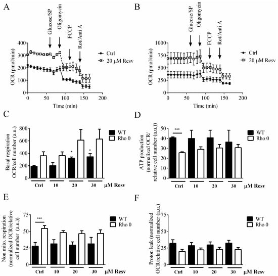 Mitochondrial activity of HeLa WT and HeLa Rho 0 following 24 h exposure to resveratrol. (A) Oxygen consumption rates (OCR), HeLa WT trace; (B) OCR, HeLa Rho 0 trace; (C) average of basal respiration measurements, HeLa WT and Rho 0, were HeLa WT 20 and 30 µM Resv compared to HeLa WT Ctrl (*: p < 0.05); (D) relative OCR related to ATP production of HeLa WT and Rho 0 calculated data after addition of oligomycin, were HeLa WT ctrl compared to HeLa Rho 0 Ctrl (***: p < 0.001); (E) relative rate of non-mitochondrial respiration of HeLa WT and Rho 0, calculated data after addition of rotenone/antimycin A, were HeLa WT ctrl compared to HeLa Rho 0 Ctrl (***: p < 0.001); (F) relative OCR related to proton leak of HeLa WT and Rho 0 calculated after addition of oligomycin minus non mitochondrial respiration. Data are presented as mean of three experiments ± SEM. ANOVA/Bonferroni used for statistical analysis.