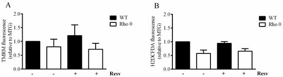 Mitochondrial membrane potential and cellular reactive oxygen species in HeLa WT and Rho 0 cells. Cells were treated with or without 20 µM Resv for 24 h, and mitochondria were labeled using (A) Tetramethylrhodamine, methyl ester, perchlorate (TMRM), as an estimate of mitochondrial membrane potential; (B) H2DCFDA to visualize reactive oxygen species. The estimates are shown as relative to a simultanous estimate of mitochondrial mass by Mitotracker green (MTG). Data are presented as mean ± SEM (n = 3) analyzed using t-test.