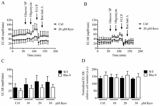 Extracellular acidification rate (ECAR) is predominantly the result of glycolytic activity. It is investigated if Resv affected ECAR in HeLa WT and HeLa Rho 0, especially based on the high OCR rates seen in the HeLa Rho 0 cells (Figure 2B). Resv concentration-dependently increased basal ECAR but had no effect on oligomycin-induced glycolysis (Figure 4). Overall, HeLa WT cells showed higher ECAR compared to HeLa Rho 0, also when treated with Resv, which is evident form the XF24 ECAR traces (Figure 4A,B) and the average of basal ECAR measurements (Figure 4C). This indicates a high reliance on glycolysis for energy production in both HeLa WT and Rho 0, even when treated with Resv.