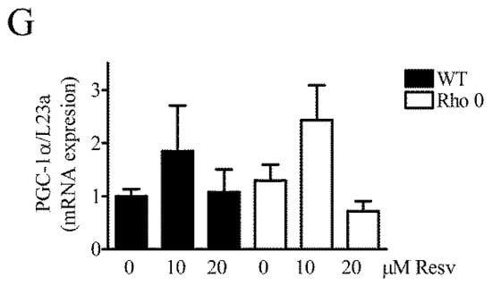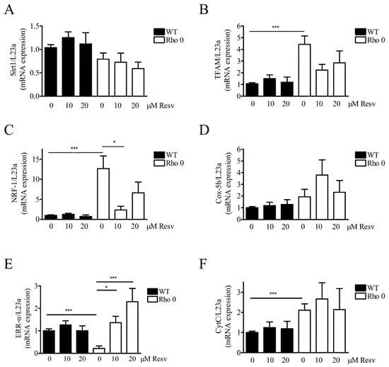 Effect of Resveratrol on expression levels of mRNA transcripts related to mitochondrial function. Relative gene expression of key genes related to mitochondrial function measured by Q-RT-PCR (quantitative reverse transcriptase polymerase chain reaction) in HeLa WT and HeLa Rho 0 cells treated with 10 and 20 µM Resv for 24 h. Expression of (A) NAD (nicotineamide dinucleotide)-dependent deacetylase sirtuin-1 (SIRT1); (B) mitochondrial transcription factor A (TFAM), HeLa WT compared to HeLa Rho 0 (***: p < 0.001) untreated; (C) nuclear respiratory factor 1 (NRF-1 also known as NFE2L1), HeLa WT compared to HeLa Rho 0 (***: p < 0.001) untreated and HeLa Rho 0 untreated compared to HeLa Rho 0 10 µM Resv (*: p < 0.05); (D) cytochrome C oxidase 5b (COX5b); (E) estrogen-related receptor alpha (ERR-α), HeLa WT compared to HeLa Rho 0 (***: p < 0.001) untreated and HeLa Rho 0 untreated compared to HeLa Rho 0 10 µM Resv (*: p < 0.05), compared to 20 µM (***: p < 0.001); (F) cytochrome complex (Cyt C), HeLa WT compared to HeLa Rho 0 (***: p < 0.001) untreated, (G) proliferator-activated receptor coactivator-1α (PGC-1α). All data are presented as relative to levels of RPL23a and are shown as mean ± SEM (n = 6). Statistical analysis performed using a t-test.