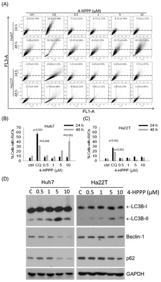 2.6. 4-HPPP-Induced Formation of Autolysosomes and the Expression of Autophagy Marker Protein in HCC Cells