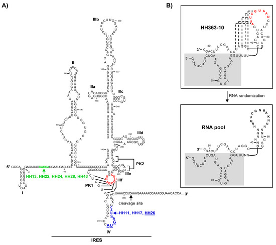 Our group previously isolated the RNA inhibitor HH363-10 using an innovative in vitro selection strategy [13,14]. This method uses two sequential steps of selection for two distinct activities, binding to the HCV IRES region and cleavage at nucleotide 363 of the genomic viral RNA. This procedure yielded chimeric RNA molecules composed of two inhibitory RNA domains, an aptamer and a catalytic domain. HH363-10 can bind to the highly conserved IIIf domain of the essential internal ribosome entry site (IRES) in the HCV genome through the aptamer domain (Figure 1) [13,14]. Domain IIIf is a key element in the three-dimensional organization of the IRES, and participates extensively in the recruitment and assembly of the 40S ribosomal particle [18,19]. It therefore appears as an interesting candidate target for the development of new antiviral molecules. HH363-10 also harbours a hammerhead ribozyme domain that cleaves (though at low efficiency) the viral RNA at a position spatially close to the IIIf aptamer-targeting site (Figure 1A). This design provided a potent inhibitory RNA able to interfere with HCV translation in cell culture [14]—a prototype molecule for further improvement.
