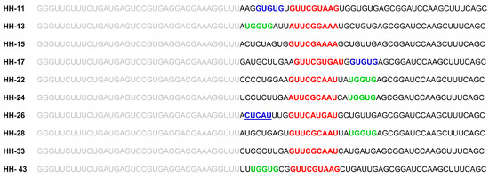 The chimeric inhibitor HH363-10 was subjected to the previously described in vitro selection procedure [13,14], with the aim of identifying inhibitory RNA molecules that act against the IRES region of the HCV genome, and that showed improved aptamer and catalytic properties. For this, an RNA pool was designed (Figure 1B), based on the HH363-10 inhibitor, adhering to the following criteria: (i) the maintenance of the sequence motif responsible for the aptamer’s interaction with the domain IIIf of the IRES; (ii) randomization of the nucleotides flanking the interacting sequence with the aim of isolating RNA molecules bearing secondary anchoring sites at the HCV IRES region besides the primary domain IIIf. This RNA pool was then subjected to in vitro selection as previously described [13]. After seven selection rounds, 10 RNA variants (HH-11, HH-13, HH-15, HH-17, HH-22, HH-24, HH-26, HH-28, HH-33 and HH-43; Figure 2) were isolated and analysed for their ability to inhibit IRES-dependent translation in vitro. Sequence analysis using the RNAup software tool [20] showed new theoretical interaction sites to map to the conserved domain IV, and to the interdomain I-II regions (Figure 1A). This showed the selection strategy to have worked properly.