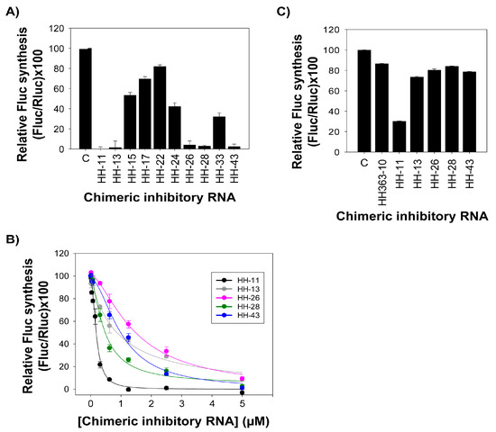 The activity of the different chimeric inhibitors was examined in in vitro translation assays involving two monocistronic RNA molecules (used as templates) in rabbit reticulocyte lysates [14]. One of these monocistronic RNAs, IRES-FLuc, encompasses the HCV IRES region directing the synthesis of the reporter FLuc protein; the other, cap-RLuc, codes for the RLuc enzyme (which is translated in a cap-dependent manner). Each inhibitor was assayed at a concentration of 5 µM. HH-11, HH-13, HH-26, HH-28 and HH-43 efficiently interfered with IRES function (Figure 3), showing inhibition values close to 97%. HH-15, HH-17, HH-22, HH-24 and HH-33 also promoted a reduction in FLuc synthesis, but to a lesser extent (20–60%). Cap-dependent translation was not affected (<5%, data not shown) for any of the assayed chimeric inhibitory RNAs at the concentration tested, demonstrating the specific nature of the inhibition of IRES function.