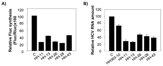 The effect of HH-11, HH-13, HH-26, HH-28 and HH-43 on HCV replication was also investigated. Huh-7 cells bearing a subgenomic replicative RNA molecule derived from HCV (Huh-7 NS3-3’; [22,23]) were transiently transfected with 175 nM of inhibitory RNA or the non-related RNA80 molecule. The amount of replicative HCV RNA was determined 24 h post-transfection by RT-qPCR, and normalized to that of the intracellular mRNA encoding for GAPDH protein (see Materials and Methods). The selected chimeric inhibitors significantly interfered with HCV replication (Figure 4B), promoting a 60–80% reduction in viral RNA positive strands with respect to the control assay. Interestingly, these data contrast with those obtained for HH363-10 (Figure 4B), which affected HCV replication much more weakly (~25% reduction in HCV RNA levels). This result confirms the improved inhibitory ability of the selected chimeric inhibitor RNAs over the parental HH363-10.