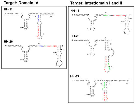 Theoretical model for the folding of the chimeric inhibitory RNAs HH-11, HH-13, HH-26, HH-28 and HH-43. In silico studies using the RNAstructure software [26] were performed to model the secondary structure of the RNA molecules under study; the figure shows the results obtained. The colour code is the same as that indicated in Figure 2.