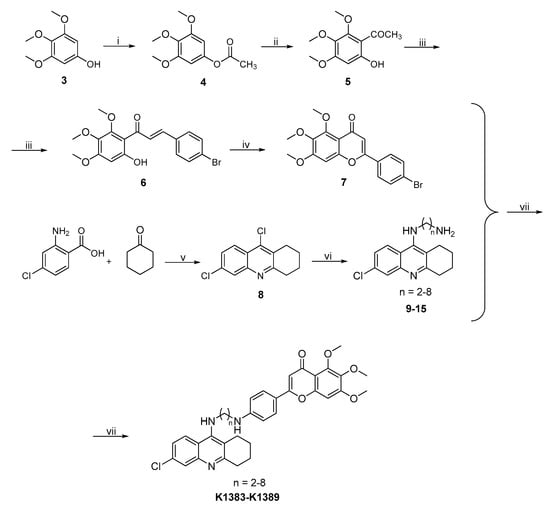- Liao, S.; Deng, H.; Huang, S.; Yang, J.; Wang, S.; Yin, B.; Zheng, T.; Zhang, D.; Liu, J.; Gao, G.; et al. Design, synthesis and evaluation of novel 5,6,7-trimethoxyflavone-6-chlorotacrine hybrids as potential multifunctional agents for the treatment of Alzheimer’s disease. Bioorg. Med. Chem. Lett. 2015, 25, 1541–1545. [Google Scholar] [CrossRef] [PubMed]