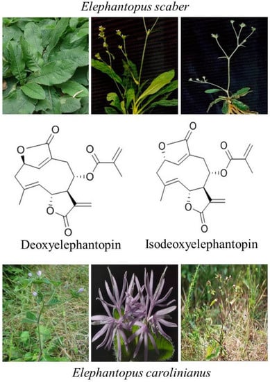 - Zhang, D.; Haruna, M.; McPhail, A.T.; Lee, K.-H. Cytotoxic germacranolides of Elephantopus carolinianus and the structure and stereochemistry of isodeoxyelephantopin. Phytochemistry 1986, 4, 899–904. [Google Scholar] [CrossRef]