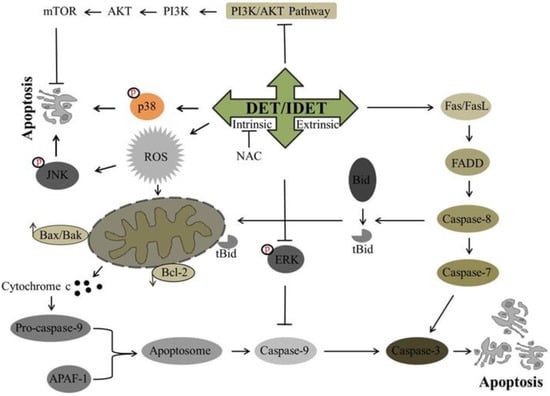 Recently, DET has been investigated for its potential anti-cancer activity against many cancer cell lines. It has been shown to trigger extrinsic apoptosis in different cancers including cervical cancer, lung cancer, and nasopharyngeal cancer. In SiHa cells [34] and A549 cells [40], DET has been reported to induce the activation of procaspase-8 while in CNE cells, DET has been shown to trigger type I and type II extrinsic apoptosis by up-regulating the expression of FasL, active caspase-10, -8, -3, and Bid truncation at high concentration. Truncated Bid enters into mitochondria, modulates Bcl-2 family proteins, and causes further release of cytochrome c. Both type I and II extrinsic apoptotic pathways merge at the caspase-3 level, induce PARP cleavage, and ultimately result in apoptosis [33]. In TS/A cells, DET induced extrinsic apoptosis by the activation of caspase-8 through TNF/TNFR-mediated activation, as DET increased the expression level of TNF-R1 protein rather than increasing the expression level of the Fas and FasL proteins [35]. The underlying mechanism of DET and IDET for inducing extrinsic apoptosis is shown in Figure 3.