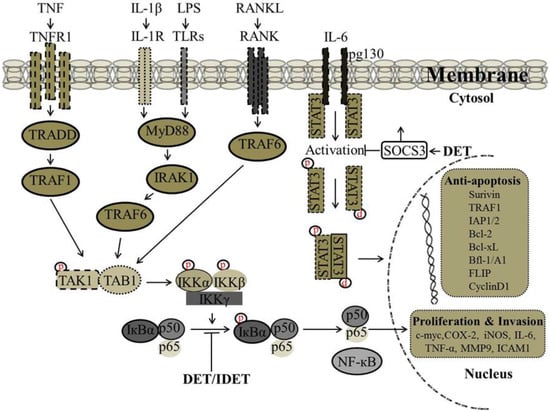 Proposed mechanism by which DET and IDET inhibit nuclear factor kappa B (NF-κB) and signal transducers and activators of transcription 3 (STAT3) activation and NF-κB and STAT3-regulated gene expression involved in cell proliferation and invasion. DET and IDET inhibited the activation of NF-κB induced by various inflammatory stimuli such as (tumor necrosis factor (TNF), lipopolysaccharide (LPS), interleukin-1 beta (IL-1β) which activates NF-κB through different pathways. DET and IDET inhibited NF-κB activation at the same step of all these stimuli. Inhibition of NF-κB activation was associated with decreased phosphorylation and the degradation of IκB-α and upstream activation of IκB kinase-alpha/-beta (IKK-α/-β) and IKK kinase activities. DET and IDET down-regulated the expression of NF-κB-regulated gene products involved in invasion such as matrix metalloproteinase (MMP-9) and intercellular adhesion molecule 1 (ICAM-1); cell proliferation such as cyclooxygenase-2 (COX-2), cyclin D1, and cellular-Myc (c-Myc); and anti-apoptosis such as inhibitor of apoptosis protein-1/-2 (IAP-1/-2), B-cell lymphoma 2 (Bcl-2), B-cell lymphoma-extra-large (Bcl-xL), Bcl-2-related protein A1 also known as Bfl-1/A1, TNF receptor-associated factor (TRAF1), FADD-like IL-1beta-converting enzyme (FLICE)/caspase-8-inhibitory protein (FLIP), and survivin). DET inhibits the activation of STAT3 by reducing phosphorylation at tyrosine-705 and up-regulates the suppressor of cytokine signaling 3 (SOCS3) which is a major component for the negative regulation of the IL-6 signaling cascade; ├ Inhibition, ↑ Up-regulation.