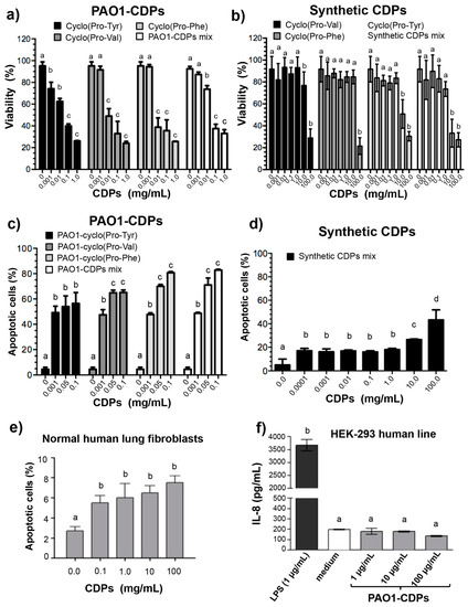 Effects of PAO1 and synthetic CDPs on HeLa cell viability and apoptosis induction. HeLa cells were incubated in CM medium and treated with CDPs for 24 h as described in Materials and Methods. Determination of viability of HeLa cells by an MTT assay treated with CDPs from P. aeruginosa PAO1 (a) and synthetic analogous CDPs (b). Induction of apoptosis in human HeLa cells by CDPs was analyzed in cultures grown in the CM medium and after treatment with CDPs for 24 h. Human cell lines were stained with annexin V and propidium iodide and analyzed by flow cytometry. The percentage of viability was determined by fluorescent cell quantitation in the dot plots, values were graphed as bars. Apoptosis induction in HeLa cells treated with PAO1-CDPs (c) and with the mixture of synthetic analogs of CDPs (d); (e) Apoptosis induction in normal human lung fibroblasts by the PAO1-CDP mixture at different concentrations determined as in (c); (f) IL-8 induction in HEK-293 cells by ELISA assay as described in Materials and Methods. Bars represent mean ± standard error (SE) of three independent experiments, n = 6. One-way analysis of variance (ANOVA) was carried out, with Tukey’s post hoc test; statistical significance (p < 0.01) of differences between treatments is indicated with different lowercase letters.