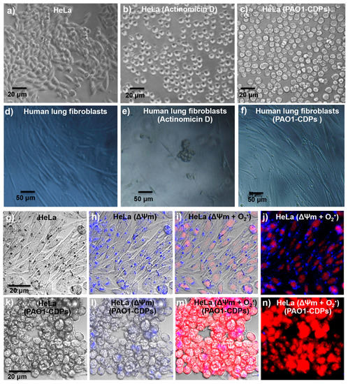 Morphological changes in human cell cultures stimulated with the CDP mixture from P. aeruginosa PAO1. (a–n) Images of human cells taken by means of phase contrast and confocal microscopy after treatment; (a–c) HeLa cell line; (d–f) Human lung fibroblast cell line. (a,d) DMSO (0.05%; negative control); (b,e) Actinomycin D (50 mg/mL; positive apoptosis control); (c,f) PAO1-CDP mixture (10 mg/mL) treatment for 2 h; (g) HeLa cells without treatment; (h) Determination of HeLa cells’ membrane potential (ΔΨm) using Rhodamine 123 without treatment. (i) HeLa cell membrane potential (ΔΨm) and superoxide (O2•−) quantification (using DHE probe) without treatment; (j) Same as in (i); but examination by dark field microscopy; (k–n) Conditions as in (g–j) but with treatment with the PAO1-CDP mixture. Images of the cells were taken at 40× magnification, using inverted phase-contrast microscope (HB0-50, Carl-Zeiss, San Diego, CA, USA) or confocal microscope (FV1000, Olympus, Center Valley, PA, USA).