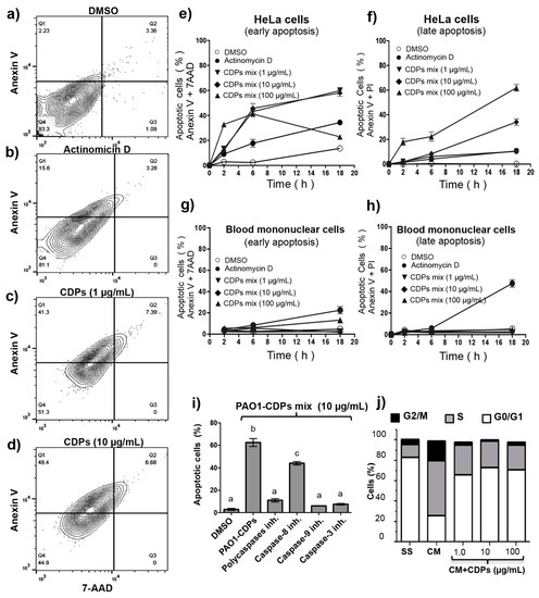 Apoptosis induction in HeLa cells by CDPs from P. aeruginosa PAO1. HeLa cells were incubated in the CM medium after treatment with PAO1-CDPs (various doses) as a function of time. Cells were stained with annexin V, 7-AAD, or propidium iodide and analyzed by flow cytometry. (a–d) The percentage of fluorescent cells determined in the dot plots is shown, corresponding to HeLa cells treated for 6 h with (a) DMSO; (b) actinomycin D (50 mg/mL), (c) PAO1-CDP mixture (1 μg/mL); (d) PAO1-CDP mixture (10 μg/mL). Q1, early apoptosis; Q2, late apoptosis; Q3, necrotic cells; Q4, viable cells; (e,f) Kinetic of induction early and late apoptosis stages in HeLa cells treated with the PAO1-CDP mixture; (g,h) Kinetics of induction of early and late apoptosis stages in blood mononuclear human cells treated with the PAO1-CDP mixture. Points of the plots represent mean ± standard error (SE) of three independent experiments; (i) Effects of inhibitors of apoptosis on HeLa cells in the presence of the PAO1-CDP mixture. The cells were incubated in the CM medium after treatment with 10 μg/mL PAO1-CDP mixture with the addition of caspases inhibitors. Cells were revealed with annexin V and analyzed by flow cytometry. The percentage of fluorescent cells (apoptotic cells) after each treatment was determined by means of the dot plots and is shown as bars in the graph. The inhibitors tested are indicated on the X-axis. Bars of the plots represent mean ± SE of three independent experiments, n = 3. One-way ANOVA was carried out, with Tukey’s post hoc test; statistical significance (p < 0.01) of differences between treatments is showed with different lowercase letters; (j) Effects of the PAO1-CDP mixture on the cell cycle in HeLa cells. HeLa cells were incubated in serum-free medium (SS) and serum-enriched medium (CM) after treatment with various doses of the PAO1-CDPs for 24 h. Cells were fixed with paraformaldehyde (4%) for 10 min on ice. Then, the cells were incubated with DAPI (1:1000) for 10 min at room temperature and analyzed by flow cytometry for DNA quantitation.