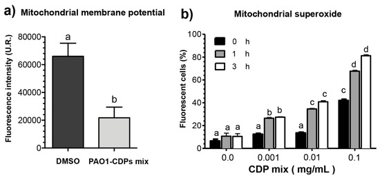 Membrane potential and superoxide quantification in HeLa cells treated with the CDP mixture from P. aeruginosa PAO1. Cell cultures were grown in the CM medium, harvested, and incubated in the CM or SS medium for 2 h. After that, the cell suspensions were incubated with or without PAO1-CDPs for 1 h at 37 °C. At the indicated time points, samples (100 μL) were resuspended in PBS and mixed with the Rhodamine 123 and DHE probes for quantitation of mitochondrial membrane potential and superoxide, respectively. The samples were incubated for 30 min and washed, and fluorescence was measured in real-time by flow cytometry. (a) Mitochondrial membrane potential and (b) superoxide quantification as percentage of fluorescent cells. Values are the mean of three independent experiments with 20,000 cells counted by flow cytometry per data point. SEM values are indicated as bars (n = 3), one-way ANOVA with Tukey’s post hoc test, significant differences (p < 0.01) are indicated by different lowercase letters.
