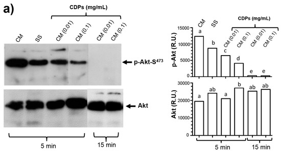 Akt phosphorylation and dephosphorylation have been reported in HeLa cells subjected to serum starvation in a cyclic biphasic behavior. Incubation periods less than 12 h led to low levels of Akt-S473 phosphorylation, but after periods longer than 12 h, higher levels of p-Akt were observed involving endogenous insulinlike growth factor (IGF) synthesis under deficient culture conditions, such as serum deprivation [30]. It is interesting whether CDPs themselves also induce endogenous synthesis of molecules that can activate the Akt pathway, and more experiments are needed to explain this biphasic behavior of Akt phosphorylation.