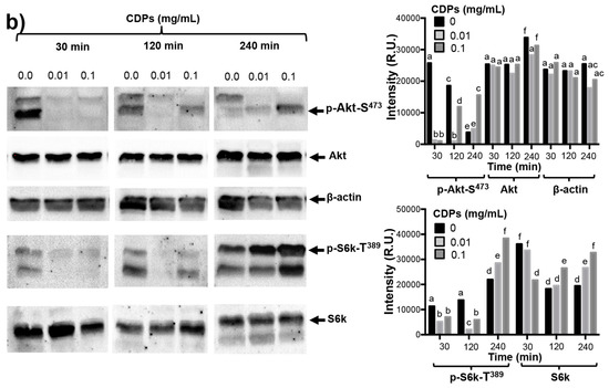 Early studies on cell death regulation dependent on the caspase-9 protein have revealed the participation of Akt and small G protein p21-Ras kinases [21], and the PI3K–Akt–mTOR signaling pathway dysregulation has been extensively associated with cancer [22,23]. In this sense, our findings showed that the apoptotic caspase-9-dependent intrinsic pathway is involved in the antiproliferative effect of the PAO1-CDPs, and that HeLa cells are arrested in G0-G1 stages of the cell cycle. Accordingly, the participation of the PI3K–Akt–mTOR signaling pathway was analyzed next.