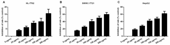To investigate the effects of daucosterol on the proliferation of HCC cells, normal liver epithelial (HL-7702) cells, HepG2 cells, and SMMC-7721 cells were treated with varying concentrations of daucosterol (0, 25, 50, 100, 150, and 200 μg/mL) for 48 h. CCK-8 assays were performed to determine the inhibitory effects of the treatments on the HL-7702, HepG2, and SMMC-7721 cells. The results showed that daucosterol significantly inhibited the proliferative ability of HL-7702, SMMC-7721, and HepG2 cells in a concentration-dependent manner, with half-maximal inhibitory (IC50) values of 214.99 (Figure 1A), 143.40 (Figure 1B), and 138.73 μg/mL (Figure 1C), respectively. Therefore, these findings suggested that daucosterol significantly suppressed the proliferation ability of HCC cells in a concentration-dependent manner.