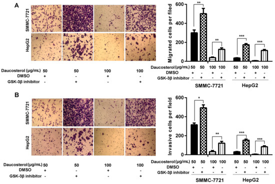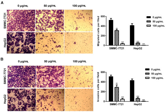 Daucosterol reduced the migration and invasion of HepG2 and SMMC-7721 cells. (A) Transwell assays were performed to evaluate the migration of SMMC-7721 and HepG2 cells treated with 0, 50, and 100 μg/mL daucosterol for 48 h (*** p < 0.001); (B) Cell invasion was detected via transwell assays in SMMC-7721 and HepG2 cells treated with 0, 50, and 100 μg/mL daucosterol for 48 h (** p < 0.01, *** p < 0.001).