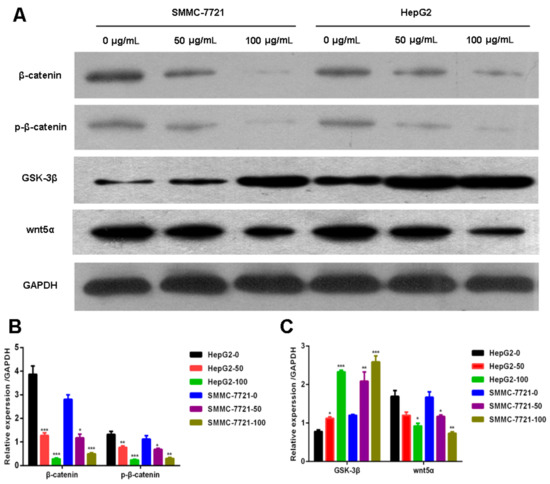 Daucosterol inhibited the expression of Wnt/β-catenin signaling proteins in HepG2 and SMMC-7721 cells. HepG2 and SMMC-7721 cells were treated with 0, 50, and 100 μg/mL daucosterol for 48 h. (A) Western blotting was performed to detect the levels of β-catenin, p-β-catenin, GSK-3β, and Wnt5α in treated HepG2 and SMMC-7721 cells. GAPDH was used as a protein loading control; (B) Daucosterol reduced β-catenin and p-β-catenin levels in HepG2 and SMMC-7721 cells (* p < 0.05, ** p < 0.01, *** p < 0.001); (C) Daucosterol inhibited GSK-3β and Wnt5α expression in HepG2 and SMMC-7721 cells (* p < 0.05, ** p < 0.01, *** p < 0.001).