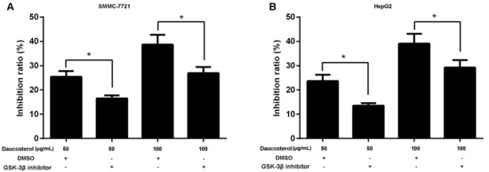 Daucosterol inhibited the proliferation of HCC cells through the Wnt/β-catenin signaling pathway. (A) HepG2 and (B) SMMC-7721 cells were treated with daucosterol (50 or 100 μg/mL) for 48 h, a Wnt signaling pathway inhibitor (SB-216763, 9 nM) for 48 h, or an equivalent amount of dimethyl sulfoxide (DMSO, control). The cell inhibition ratios in treated SMMC-7721 and HepG2 cells were measured via CCK-8 assays (* p < 0.05).