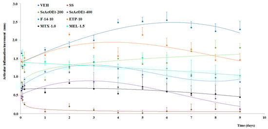 The inhibition percentage of the joint edema induced by K/C was calculated on the last experimentation day. At this time, inhibition of local inflammation was 94.6, 62.4, and 80.3% for SeAcOEt 400, F-14, and MTX-1.0, respectively, while the remaining treatments demonstrated low inhibition, with SeAcOEt at 200 mg/kg, ETP at 10 mg/kg, and MEL at 1.5 mg/kg with 21.7, 36.20, and 54.9%, respectively.