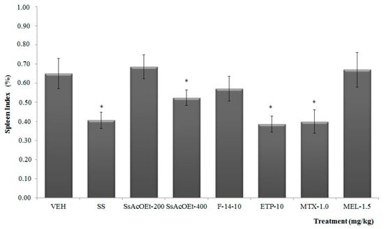The effect of K/C administration was observed on the spleen, which was measured through its weight and calculated the percentage respect to total animal weight. The group with only i.a. K/C showed a significant increase in the spleen index (%) in comparison to the SS group. And animals that received SsEtOAc at 400 mg/kg, ETP, or MTX, presented a decrease in spleen percentage (Figure 3).