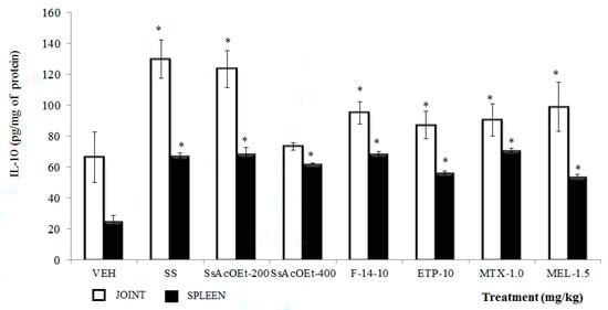 IL-10. In Figure 4, the concentration of IL-10 in joint tissue was significantly lower in animals administered only kaolin/carrageenan (K/C), compared to the group with only SS (p < 0.05; Figure 4). All treatments (with the exception of SsEtOAc-400), induced a significant increase in IL-10 concentration, with respect to the VEH group (p < 0.05). The IL-10 concentration in the spleen of all groups indicated a significantly increment, with respect to the VEH group (p < 0.05).