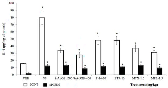 IL-4. All treatments from S. schiedeana and drugs utilized as controls caused a significant increase in IL-4 in both joint and spleen in comparison with the VEH group (p < 0.05; Figure 5). In joint, the data were not similar to those of the group with SS (p < 0.05).