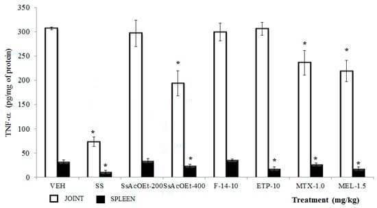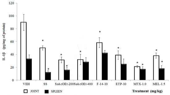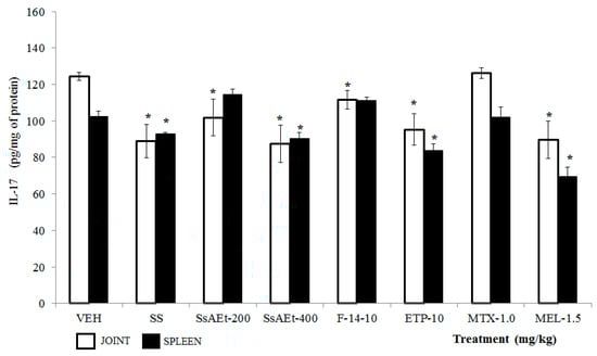 IL-17. This cytokine was elevated in joint and spleen of mice that only received VEH, and data were different from those of the SS group (p < 0.05). The complete extract of SsEtOAc (200 and 400 mg/kg), F-14, and ETP demonstrated a significant decrease in the concentration of IL-17. For spleen, only the higher dose of SsEtOAc and ETP demonstrated a significant decrease. In the case of the drugs, only MEL at 1.5 mg/kg diminished this cytokine in both organs (p < 0.05; Figure 9).