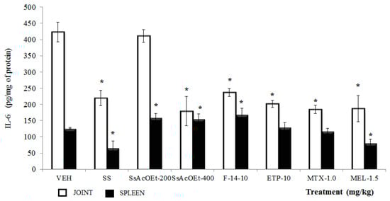 IL-6. This cytokine was elevated in joint and spleen of animals of the VEH group with respect to those that only received sterile SS (p < 0.05). Administration of SsEtOAc at 200 mg/kg did not modify this result in joint; however, application of SsEtOAc at 400 mg/kg, F-14, and ETP (at 10 mg/kg), with MTX and MEL, induced a decrease in the concentration of IL-6 with respect to the VEH group (p < 0.05; Figure 8). However, this behavior was not observed in spleen; instead, for example, for SsEtOAc (two doses) and F-14, there was an increase of this parameter (p < 0.05), and only MEL gave rise to a decrease of IL-6 in this organ (p < 0.05; Figure 8).