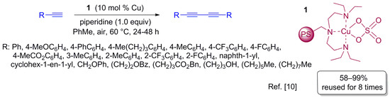 Carbon–carbon bond forming reactions are essential tools for building the carbon skeleton of organic compounds, and therefore they represent an elemental content of organic synthesis. Copper-catalysed oxidative homocoupling of terminal alkynes known also as Glaser coupling [8] introduce a suitable method for the preparation of 1,3-diynes, which are needful basic building blocks in the synthesis of many natural and pharmaceutical products, as well as some advanced functional materials [9]. A successful application of the heterogeneous catalyst intended for this reaction can be documented on the example of recyclable catalyst 1, which is based on the complex consisting of N,N,N′,N′-tetraethyldiethylenetriamine and CuSO4, anchored on polystyrene cross-linked with 1% divinylbenzene (DVB) (Scheme 1) [10].