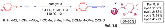 Sonogashira cross-coupling of ten substituted iodobenzenes with phenylacetylene catalysed by polystyrene-supported Cu(II) complex 2 was described by Mandapati et al. [13] (Scheme 2). Heterogeneous catalyst 2 was prepared by the reaction of commercial chloromethylated polystyrene (5.5% DVB) with N,N-dimethylethylenediamine and subsequent complexing with CuBr2. Cross-coupling reactions proceeded in aqueous media in the presence of K2CO3 and cetyltrimethylammonium bromide (CTAB) at 110 °C for 10 h. The yields of substituted acetylenes ranged between 66–85%. Reusability of the catalyst was tested for the reaction of iodobenzene with phenylacetylene (Cycle 1: 85%; Cycle 2: 83%; Cycle 3: 82%; Cycle 4: 77%) (Scheme 2).