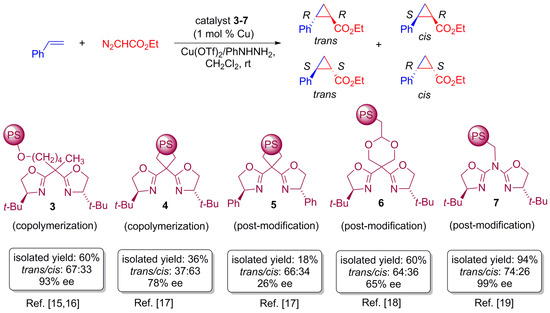 Reactions where carbenes were transferred onto unsaturated substrates (alkenes, alkynes, arenes, imines, aldehydes etc.), have provided a number of useful products [14,15,16,17,18,19]. The mentioned carbenes can be generated in situ from diazo compounds by the application of transition metal-based catalysis [14]. The most widespread example of such reaction implemented at large scale is copper-catalysed cyclopropanation of substituted alkenes with alkyl diazoacetates. Therefore, many homogeneous as well as heterogeneous catalytic systems have been developed for this reaction [14,15,16,17,18,19,20]. In the case of Cu(I) complexes, bisoxazoline ligands [15,16,17,18] and azabisoxazoline ligands [19] were used, anchored on pearl-like polystyrenes. For the immobilization of ligands either a copolymerization strategy (catalysts 3 and 4) or post-modification strategy (catalysts 5–7) was utilized. The catalysts were generated in situ by the coordination of copper(II) triflate and consequent reduction with phenylhydrazine (Scheme 3) [15,16,17,18,19,20].