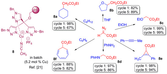The next reusable catalyst 8 was prepared by coordination of [Cu(MeCN)4][PF6] on tris(triazolyl)methane anchored on commercial Merrifield resin™ (Scheme 4) [20]. Reactions of catalyst 8 with ethyl diazoacetate led to formation of carbene (:CHCO2Et), which was used for six reactions with following substrates: cyclohexane (C–H insertion), tetrahydrofuran (THF) (C–H insertion), ethanol (O–H insertion), aniline (N–H insertion), phenylacetylene (cyclopropenation), and benzene (cyclopropanation/ring expansion). In the case of the usage of benzene as substrate, this was the first representative of the Büchner reaction performed under the conditions of heterogeneous catalysis (Scheme 4) [21].