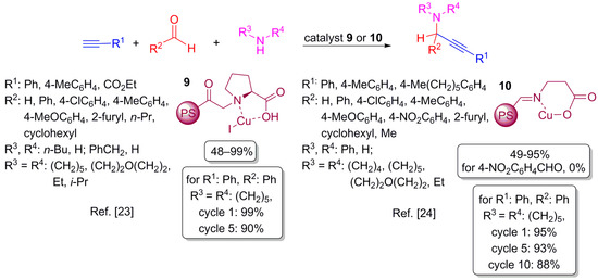 Propargylamines—which represent important intermediates for the synthesis of significant pharmaceutical polyfunctional substances—can be synthesized by the addition of alkynes on the imine bond (Scheme 5 and Scheme 6) [22,23,24,25,26]. Propargylamines had been traditionally prepared by nucleophilic addition of magnesium or lithium acetylides on imines or their derivatives [22]. The disadvantage of such synthesis consists in the necessity of use of stoichiometric amounts of acetylides under very strict reaction conditions and absolute moisture exclusion. Simplification of this reaction brought the utilization of transition metal complexes—especially Cu(I) complexes [22]. Unfortunately, the isolation of these homogeneous complexes from the reaction mixture as well as their recycling is unfeasible. Further facilitation started with the application of Cu(II) complexes immobilized on pearl-like polystyrene and with the reaction performed as a one-pot multi-component reaction [23,24,25,26]. Catalyst 9 was prepared by the reaction of l-proline with chloroacetylated pearl-like polystyrene and subsequent complexation with CuI (Scheme 5) [23]. The reaction of all three components (alkyne/aldehyde/amine: 1/2/1.25; 5 mol % Cu) catalysed by 9 proceeded under laboratory conditions [Dimethyl sulfoxide (DMSO), 2 h or 12 h at room temperature] with high yields of isolated propargylamines (48–99%). Formaldehyde and aliphatic aldehydes provided higher yields (78–99%) than aromatic aldehydes (e.g., Ph-C≡CH/4-MeO-C6H4CH=O/piperidine: 48%). For the reaction of phenylacetylene, formaldehyde and piperidine catalysed by catalyst 9, several solvents were tested: water (0%), methanol (25%), toluene (30%), THF (42%), MeCN (87%), DMSO (99%). For the same reaction in DMSO, the recovery and reuse of catalyst 9 was tested, when only slight decrease in yields for each cycle was observed: 99%, 99%, 98%, 95%, 90%, 90% (Scheme 5) [23]. Corresponding polymer complexes with CuBr, CuCl and CuSO4 were also studied; however, they were less efficient [23].